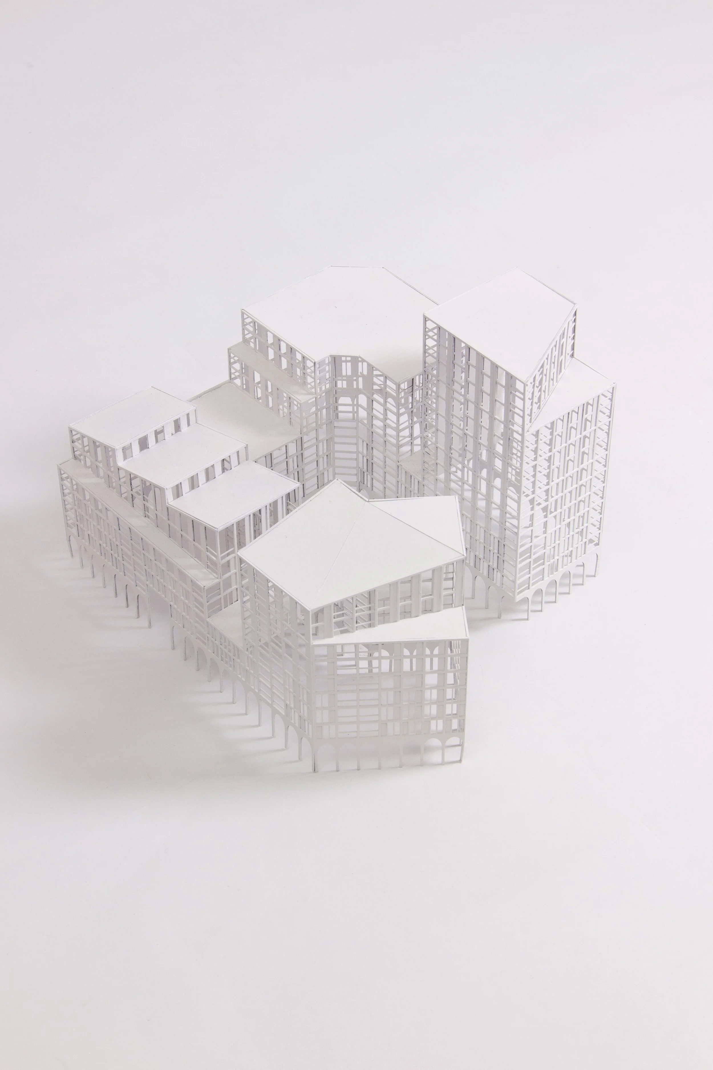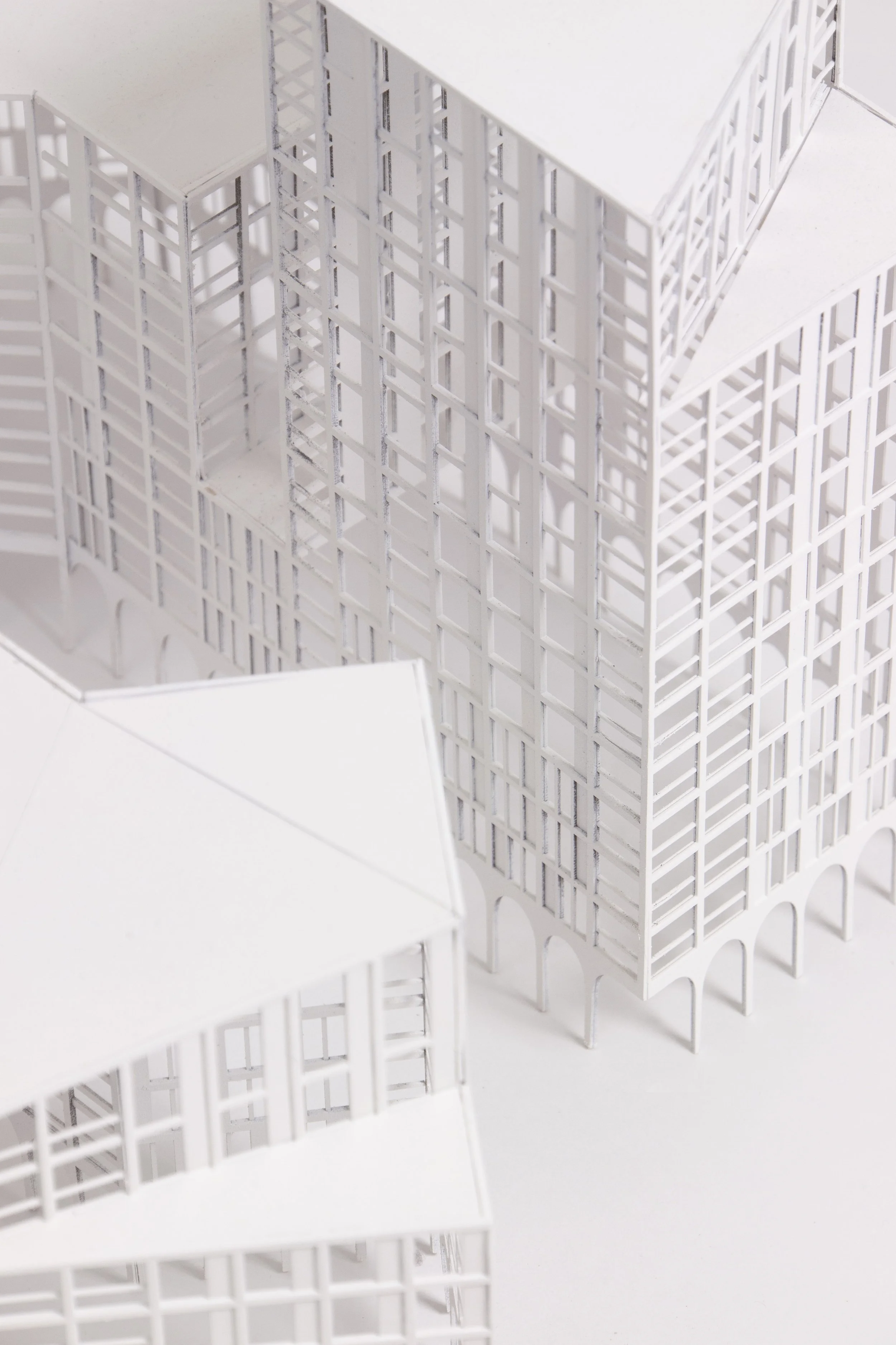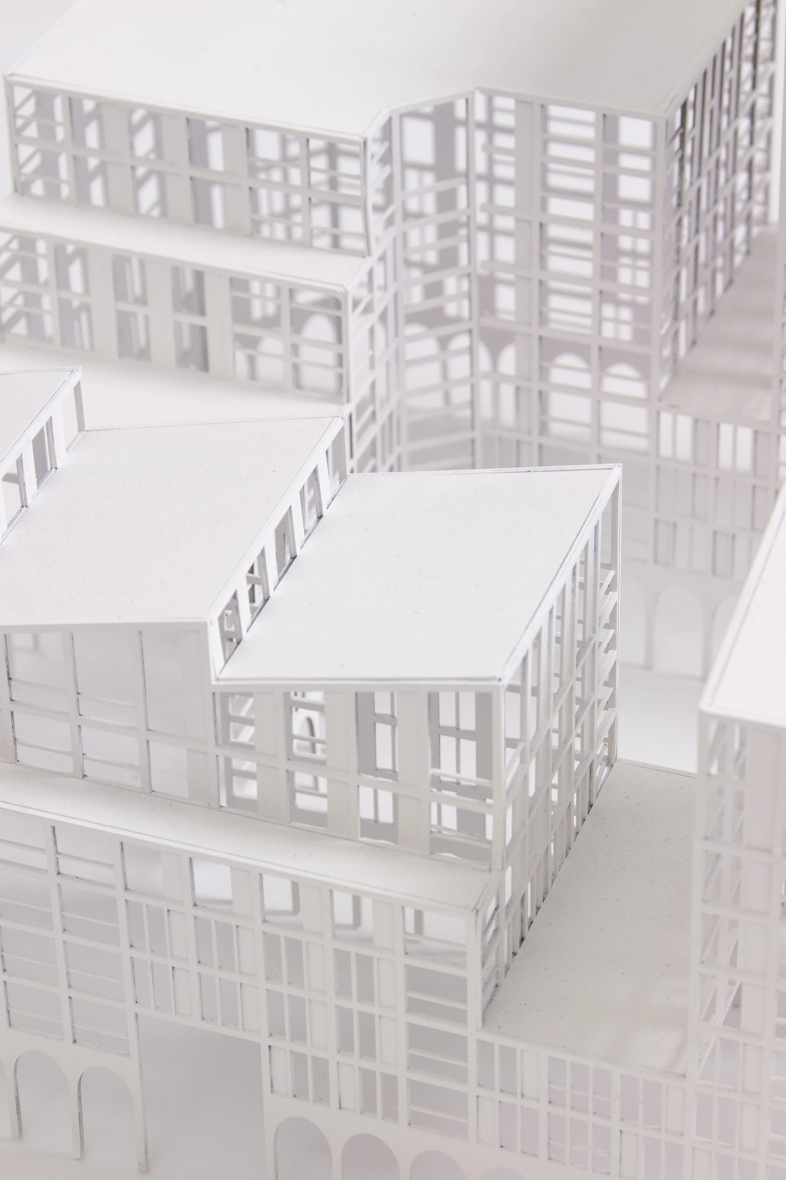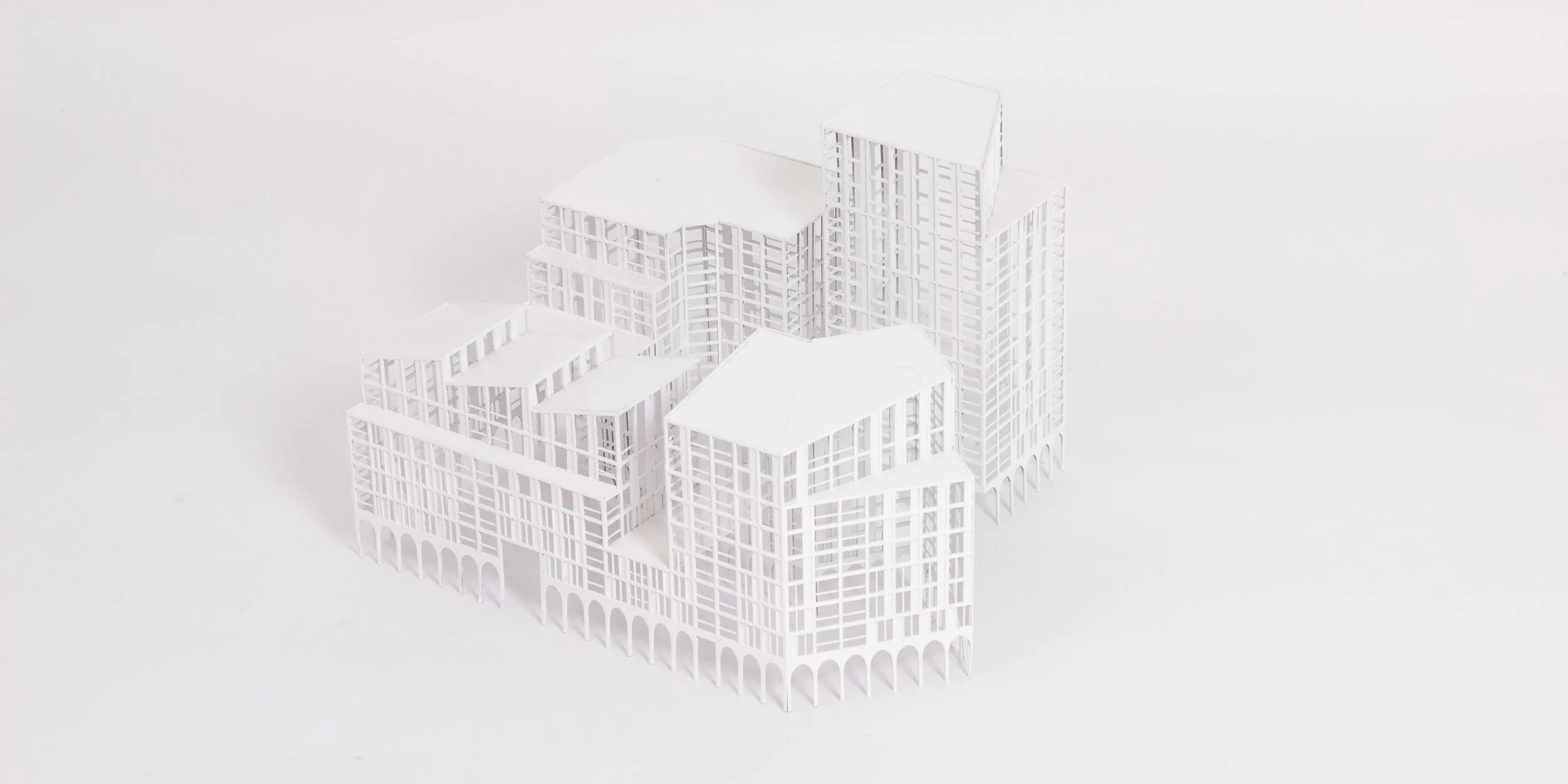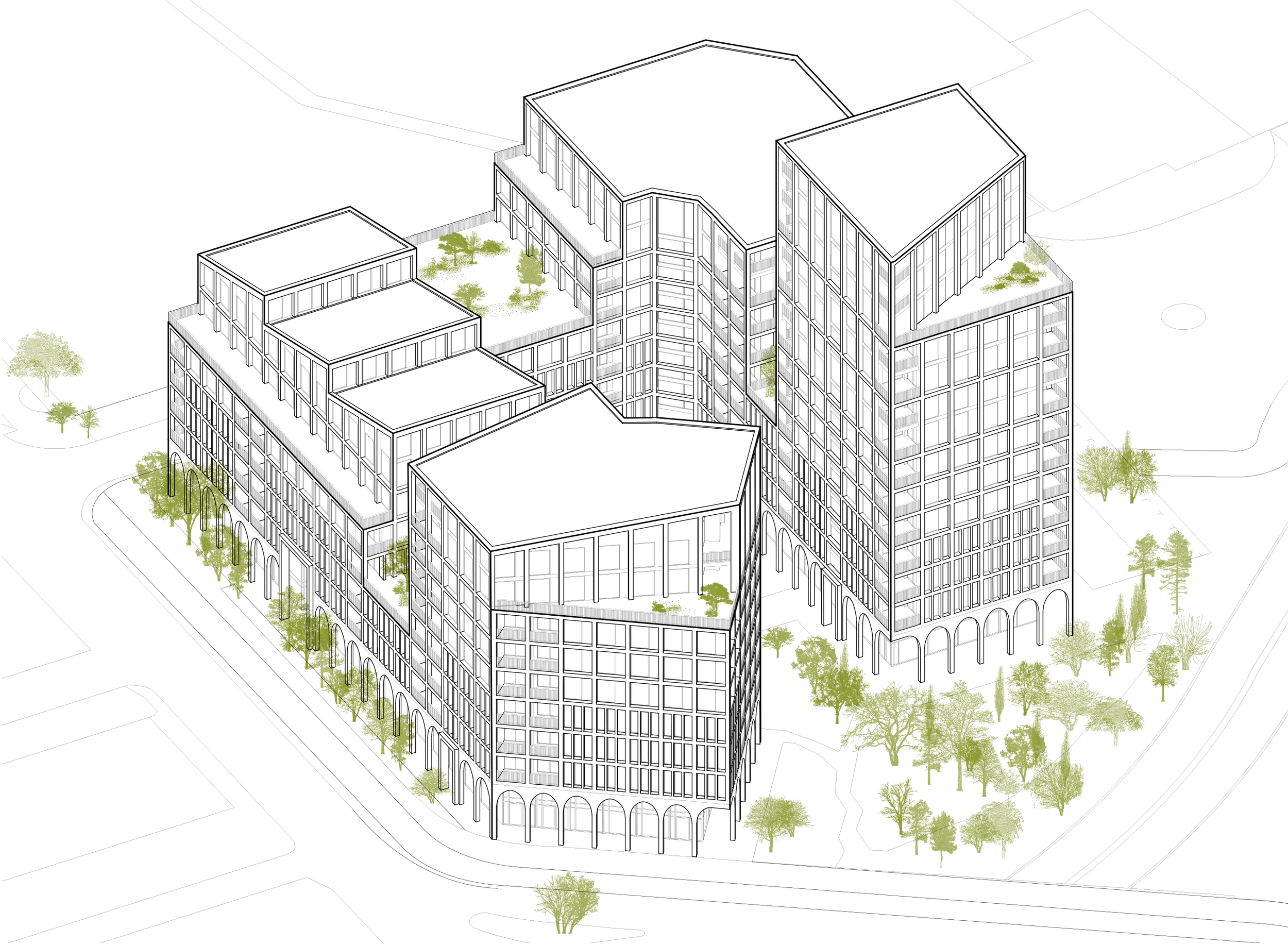 The ground level is set on a plinth (housing the affordable workspace). It is delineated from the building above by an arched colonnade design. With large 3-4 storey openings to highlight the entrances into the courtyard and residential spaces above.