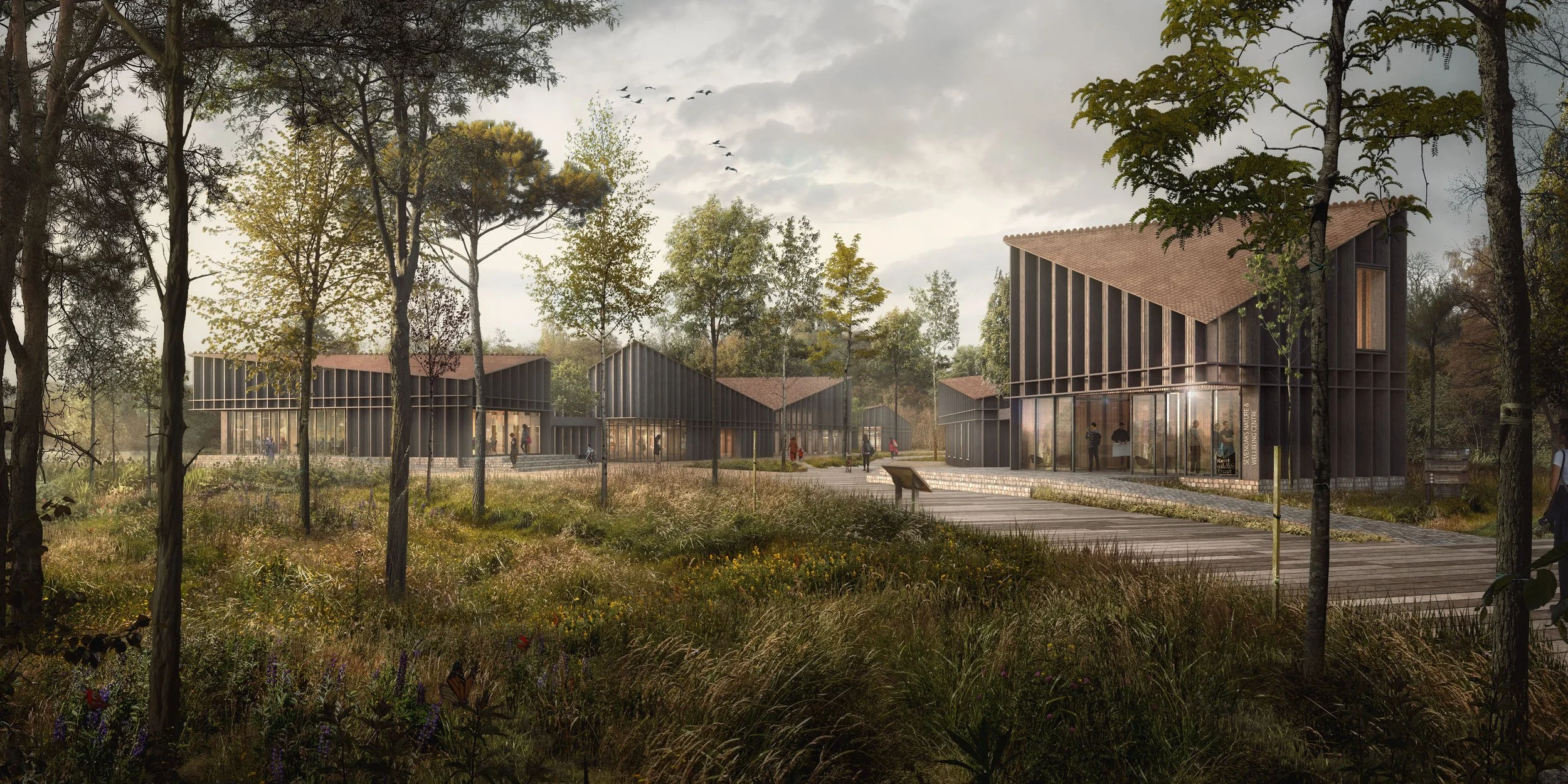 The centre is made up of a series of large ‘hide’ buildings which sit staggered within the landscape and provide vantage points to the surrounding lakes and woods.