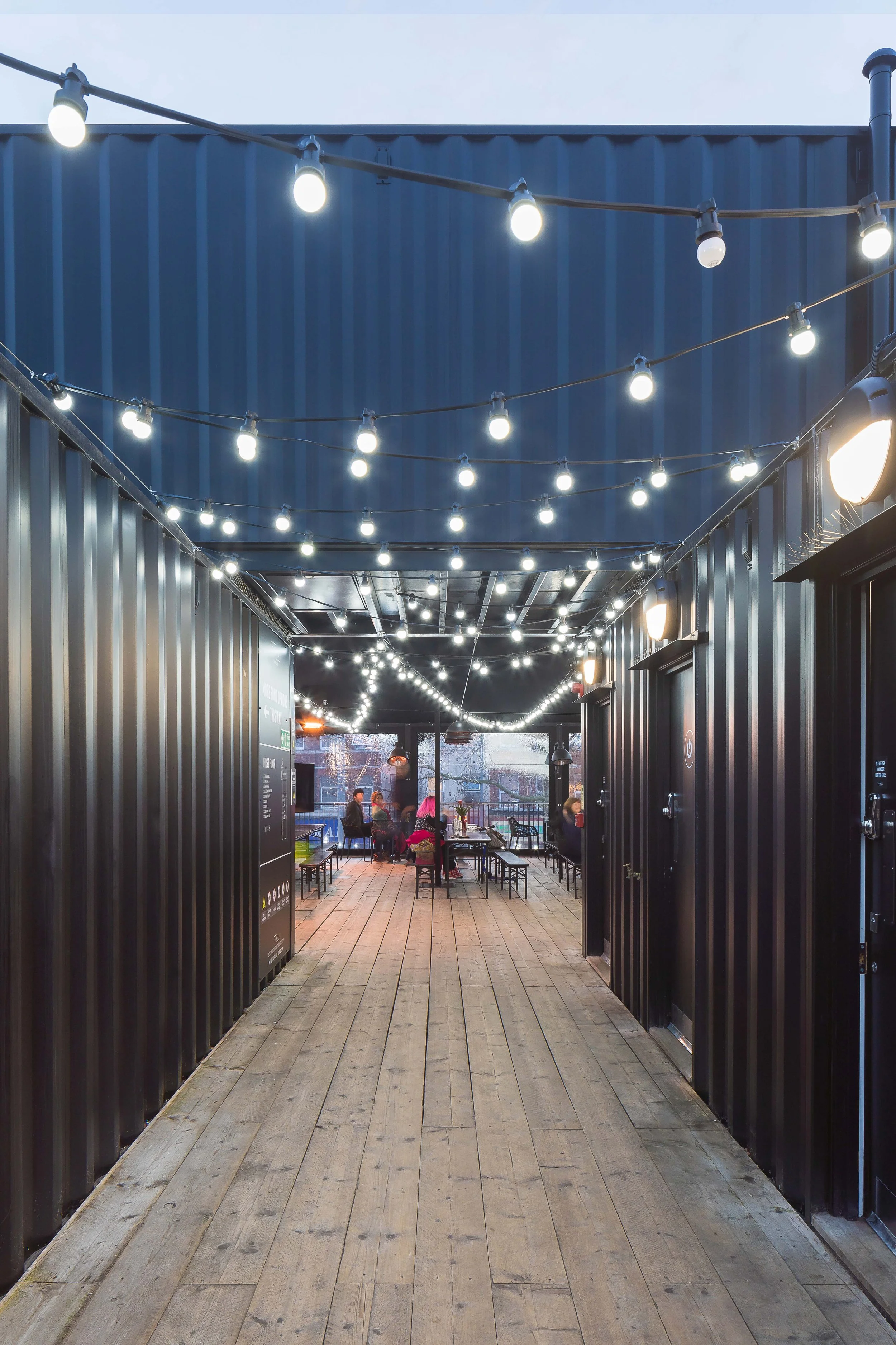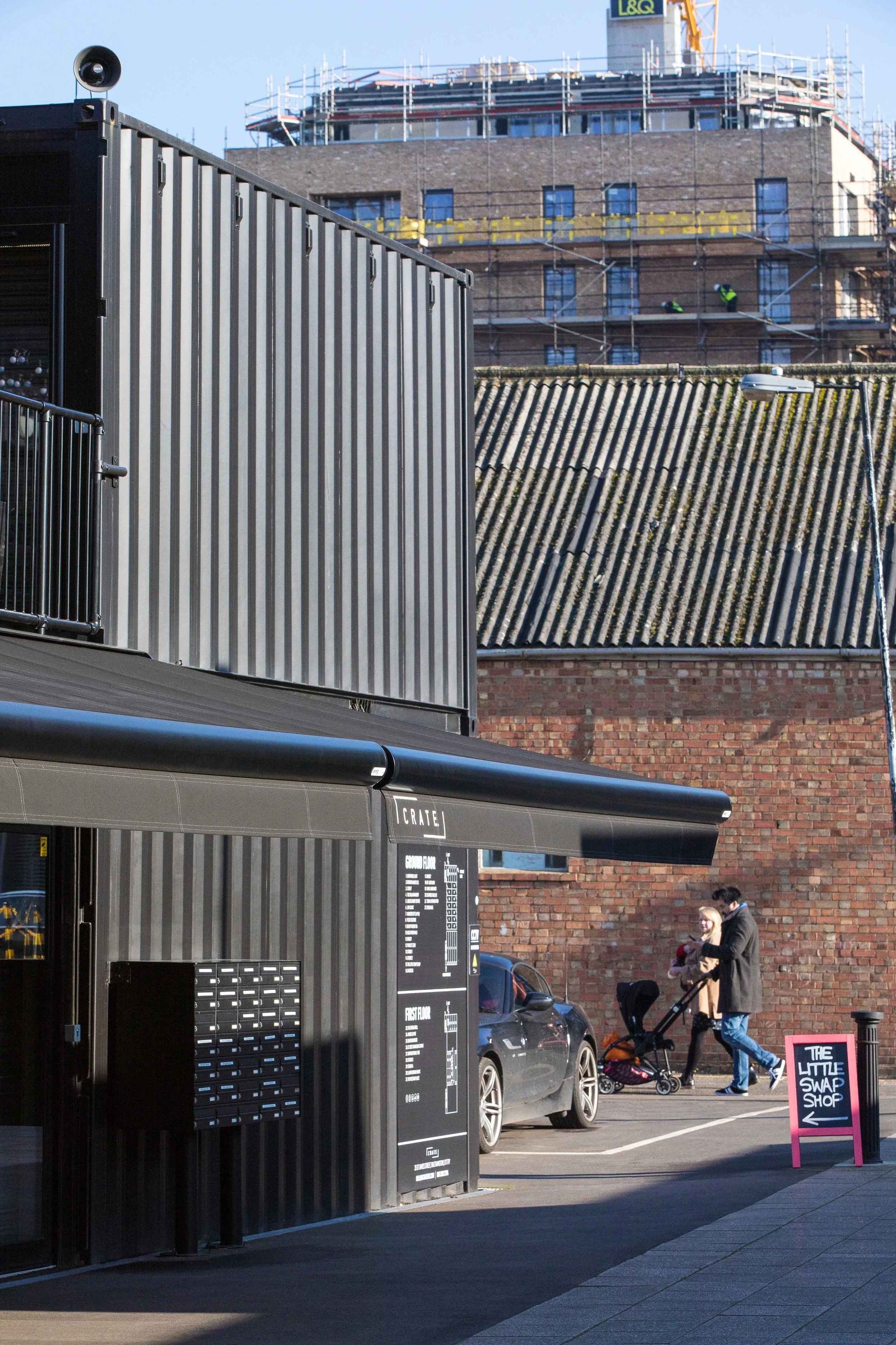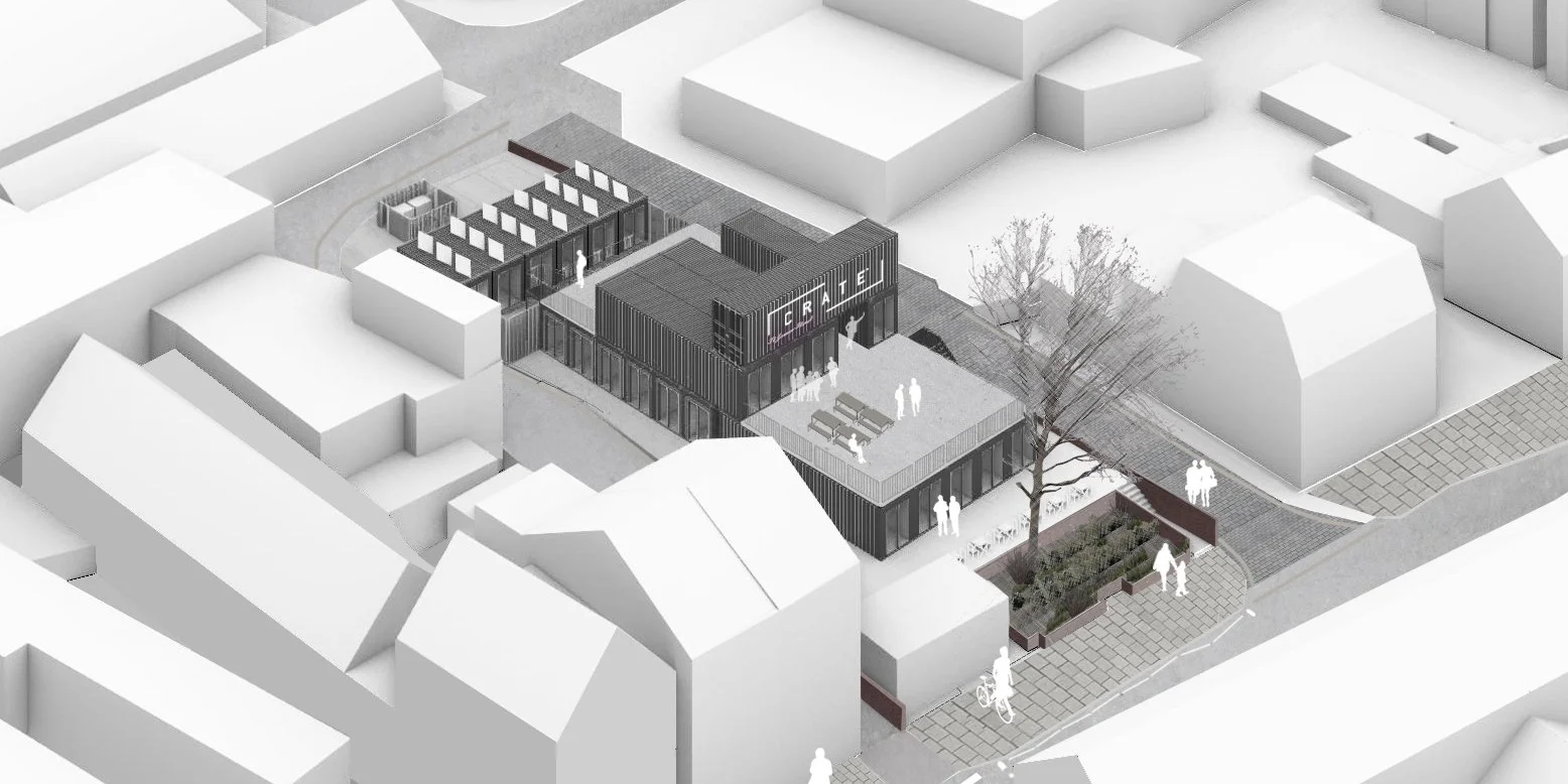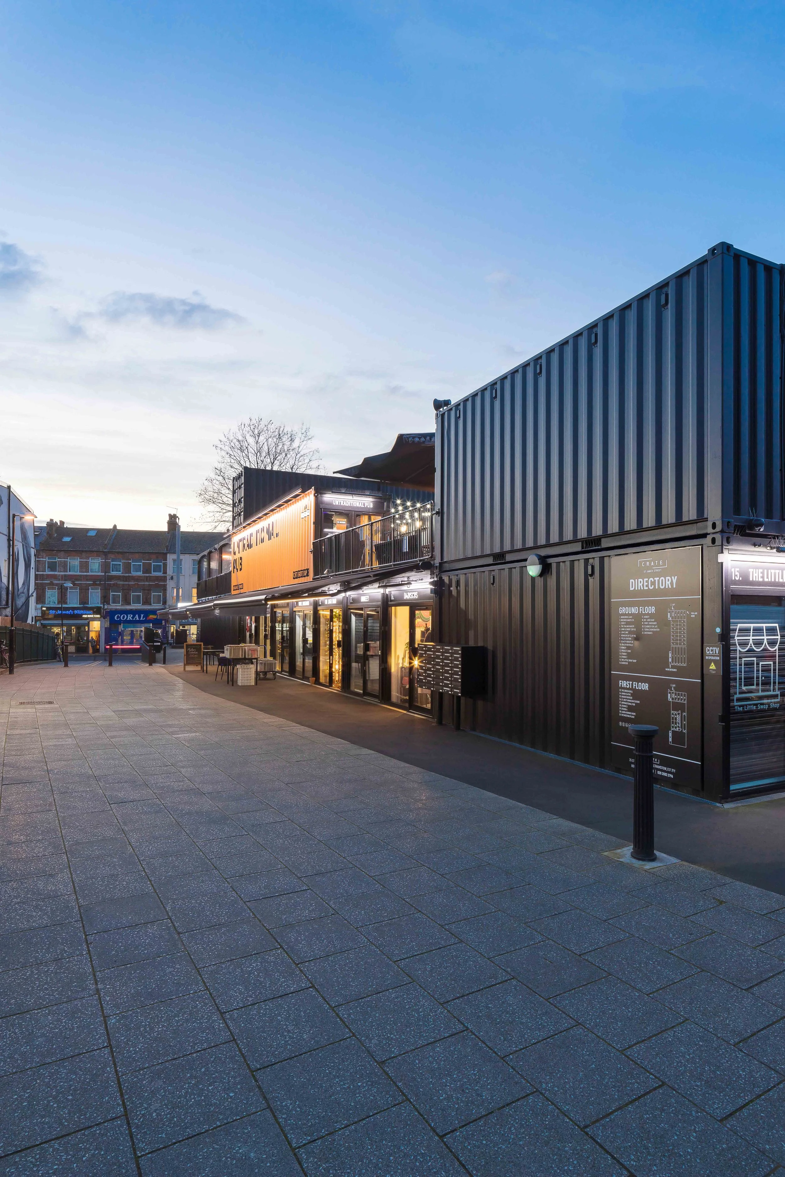 Formed from reused and adapted shipping containers that can be quickly established on the site. They are stacked and arranged over two levels with a continuous frontage of units around the perimeter. A variety of sizes and types of space is offered, by adapting the containers in different ways.