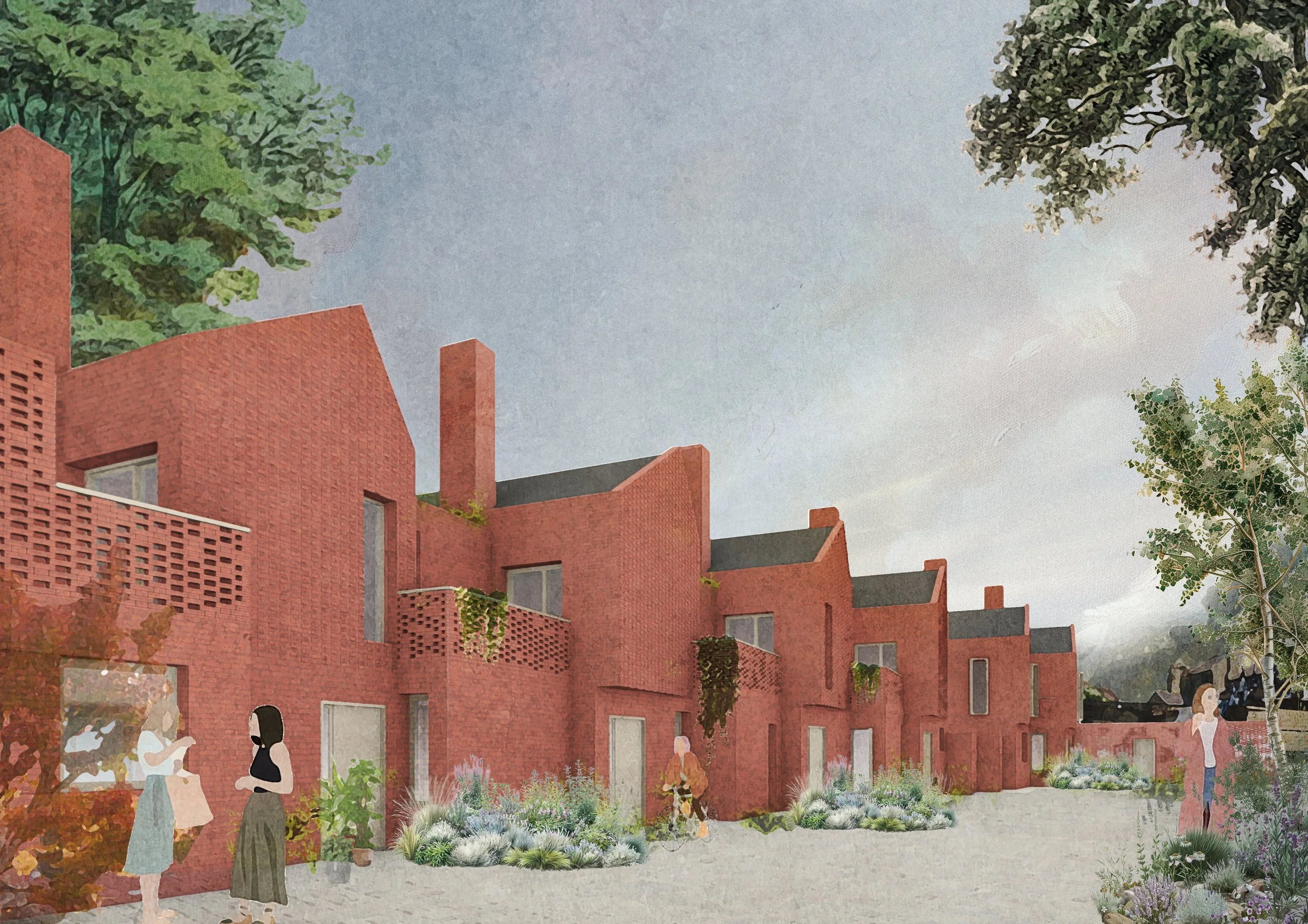 To reduce embodied carbon and operational energy use we designed the buildings in cross laminated timber dressed in bricks made from recycled aggregates. Each home uses air source heat pumps and solar panels for energy production and has green roofs.